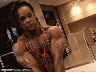 Athena Signakis' back seems to be pure muscle with a thin layer of skin over it. A living anatomical sculpture. And one I can quite easily picture myself attempting to massage, attempting because I press as hard as I can but can't make any impact on those slabs of granite (and meanwhile Athena lies there, feeling nothing and wondering whether I've started yet). And if you can pull your eyes away from that magnificent sight for a moment, check out Aleesha Young and what I can only describe as her "lat overhang". Mouth-watering female muscle meat right there.